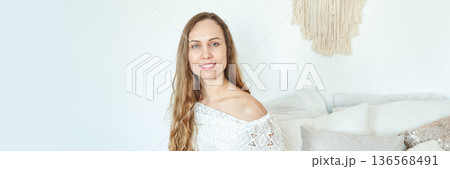 Young caucasian female in white top smiling in minimalist room with textured
