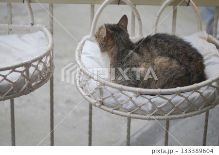Cozy cat resting in a hanging bed on a balcony