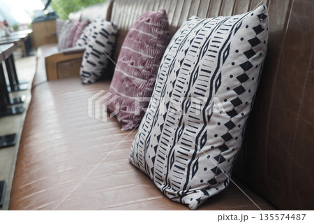 Pillows arranged on a leather bench in a social space