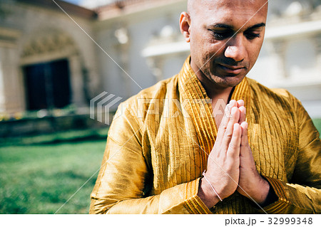 Indian Man Greeting Namaste in Gold Kurta atTemple