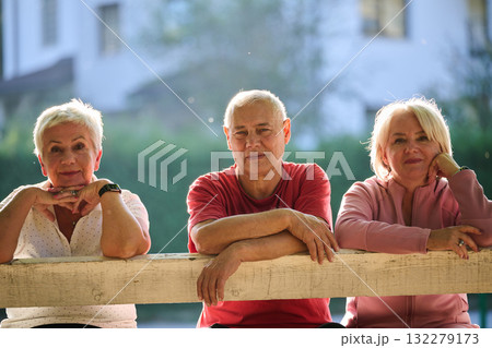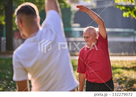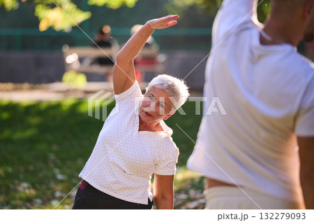 A group of seniors follows a trainer, engaging in outdoor exercises in the park, as they collectively strive to maintain vitality and well-being, embracing an active and health-conscious lifestyle in