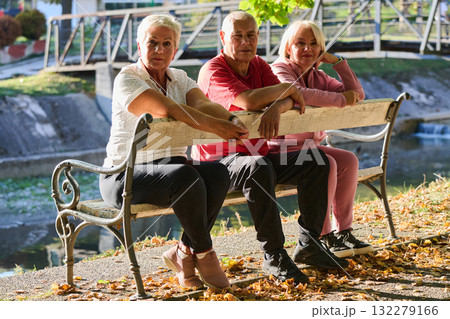 A group of elderly individuals, including a senior man and two older women, sits in a park on a sunny autumn day, embodying the concept of healthy aging through companionship, relaxation, and outdoor