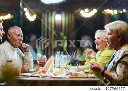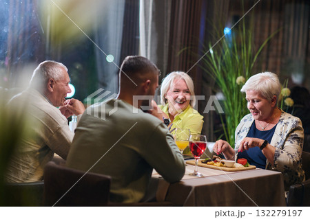 A group of family friends, comprising a young grandson and older individuals, share a delightful dinner in a modern restaurant, exemplifying the concept of healthy aging through intergenerational
