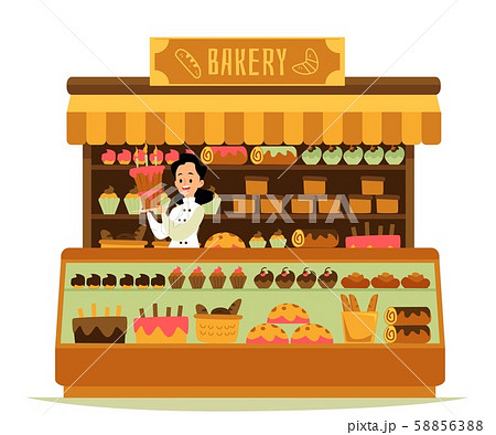 Bakery shop - cartoon chef baker woman holding big cake standing behind counter