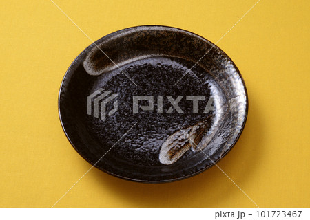 一塊放在黃布上的黑色日本盤子