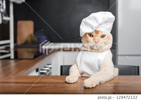The cat is a cook in the kitchen.