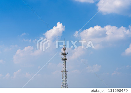 Antenna tower of telecommunication and signal repeater of mobile communication with blue sky, over