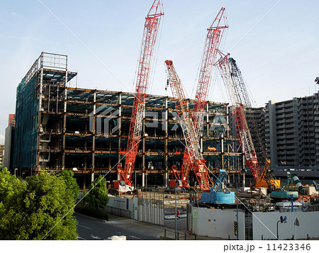 Close-up industrial big cranes working on construction site to build modern tall buildings on evening, growth in the city