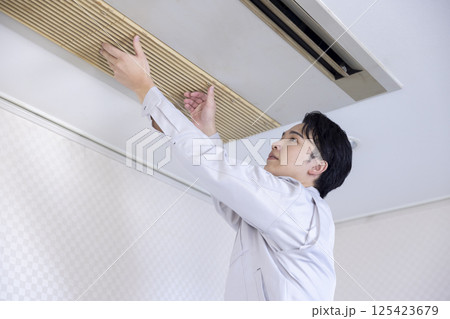 樓宇維護:一名身穿工作服的男子正在檢查空調