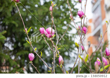 Magnolia x soulangeana buds on branches near residential building facade in spring. Urban planting, seasonal flowering cycle, ornamental horticulture and city landscape integration
