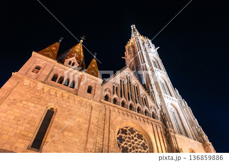 Fisherman's Bastion in Budapest illuminated at night. The historic structure features turrets and arches, surrounded by a quiet plaza.