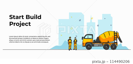 Vector illustration of mixer trucks and employees. Modern flat in continuous line style.
