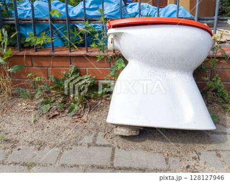Old dirty toilet bowl on sidewalk