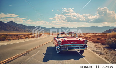 Vintage convertible on empty highway with deserts and mountains sparks nostalgia and adventure.