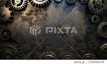 A collection of weathered gears of various sizes adorns a grunge metal surface, creating an industrial steampunk background.