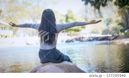 Back view of young woman sitting on rock by calm river, arms outstretched, enjoying nature in sunny park with soft background.