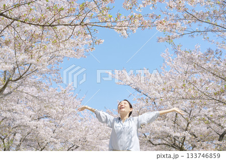 一位女士在櫻花前深呼吸