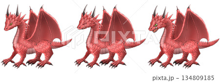 一條側躺的紅色巨龍,雙翼展開,臉部表情各異。
