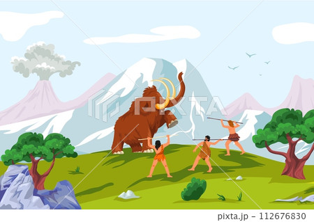 Mammoth hunting. Woolly mammoths and caveman with primitive spear weapons, neanderthal human hunter animals prey stone age prehistoric period cartoon landscape vector illustration