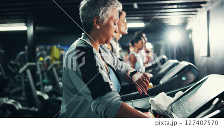 Runner, smart watch and fitness with woman on treadmill for speed timer, workout and training stats. Performance tracking, cardio and wellness with mature person on running machine for endurance