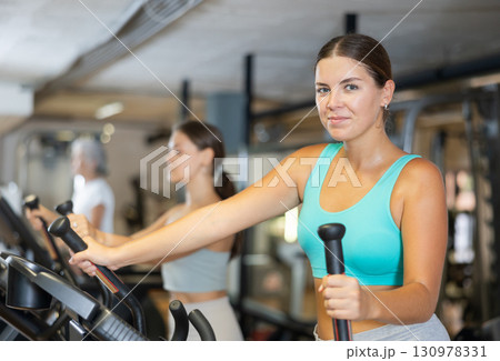 Sitting on the special chair. Young woman in fitness center is doing exercises