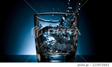 A mystical sword composed of blue water and ice, with golden accents, pierces the surface of a tranquil lake. The blade sparkles in the moonlight, leaving a trail of shimmering droplets.