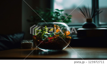 Tranquil Home or Office with a Spherical Aquatic Plant Terrarium on a Wooden Table