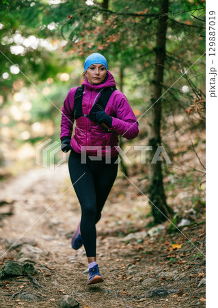 Determined Female Athlete Running with Focus Through a Dense Pine Forest, Embracing Strength and Nature