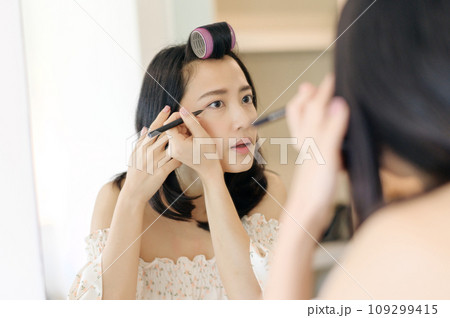 Beautiful young Asian woman applying makeup in front of the mirror. Lifestyle people concept. Advertisement for skin cream, anti-wrinkle cream, baby face