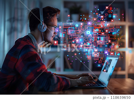 Young man at laptop, browsing social media, listening to music, checking emails, 3D visualization of online platforms