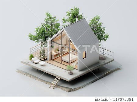 Tiny loft-style house, 3D isometric mockup, white background, contemporary design, realistic details