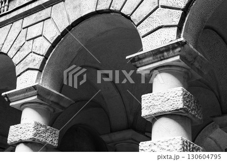 Black and white photograph showcasing detailed stone columns and arches