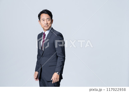 穿著西裝、淺藍色背景、回頭看的英俊男子的全身
