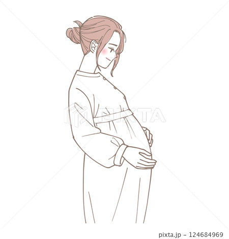 一位身穿白衣的孕婦輕輕地撫摸著自己的肚子。孕婦肖像