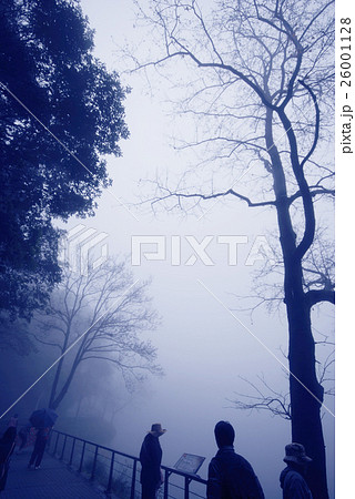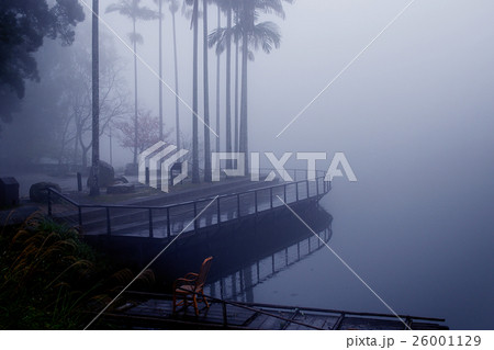 桃園縣 後慈湖 濃霧中的一排椰子樹