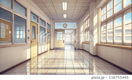 夕陽下放學後的無人教室和走廊/學校位置、青春和懷舊的概念形象