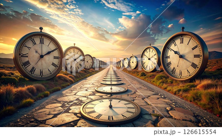 一條無盡的道路和一個巨大的慢動作時鐘的幻想景觀