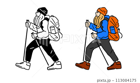 女性健行、單色和彩色的向量圖解