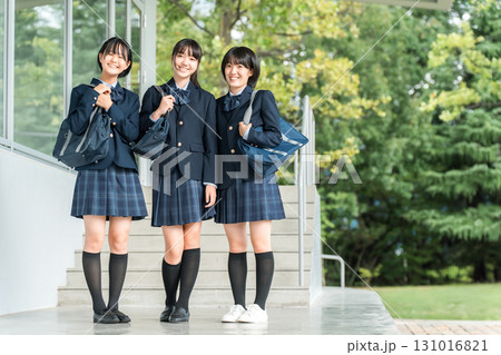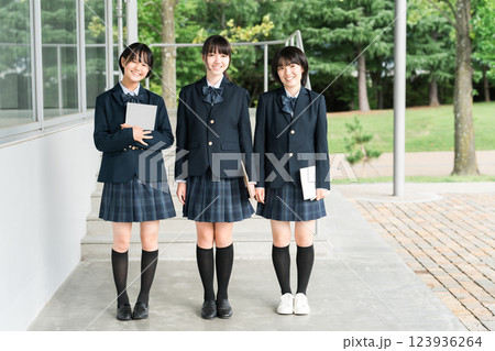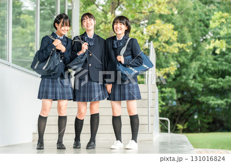 國中生、高中生、女高中生面帶笑容地走過教學大樓(上學、回家、上下學)
