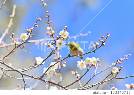 一隻日本繡眼鳥(梅白)正從李子樹上吸食花蜜