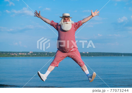 An elderly man in a striped retro swimsuit and Boater runs and jumps along the beach. A cheerful gray-haired old man with a beard in a hat is resting at the sea.