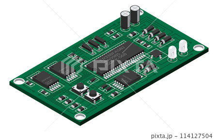 Isometric electronic board. Isometric printed circuit board with electronic components. Electronic components and integrated circuit board