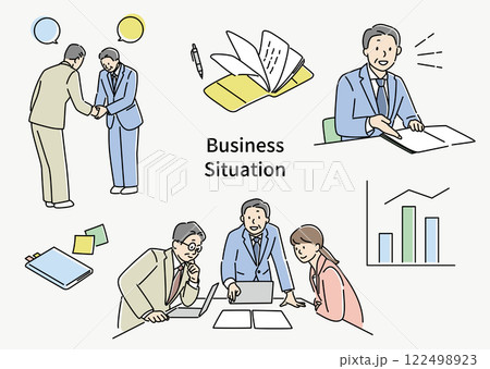 一套簡單的線條畫插圖,穿著西裝的男女,鞠躬,解釋和指導(帶有講話泡泡)