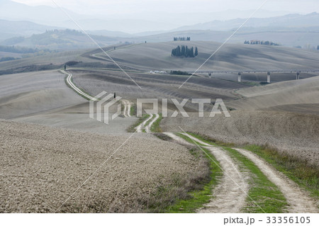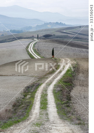 Italy, Tuscany, San Quirico D'orcia, Long twisting rural road leading through endless gray fields and lonely cypress trees