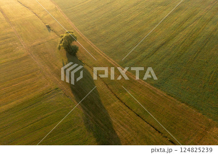 Morning scenery, aerial view, with road passing between forest and agricultural fields