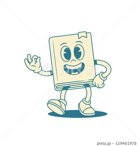 Smiling childish book cartoon character greeting with open palms vector illustration