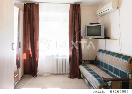 The interior of a room that was empty before the move, there is a sofa and a chest of drawers in the room