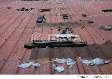 Worn Metal Roof with Discarded Items and Tools in an Urban Setting