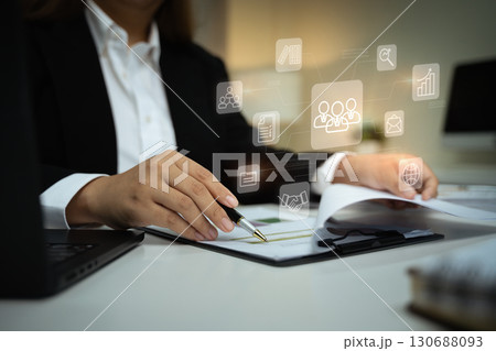 Modern HR management concept with businesswoman reviewing employee data and digital interface icons