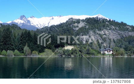 Lakeside cottage on a sunny morning, snow-capped mountains in the background in a southern Argentine landscape.